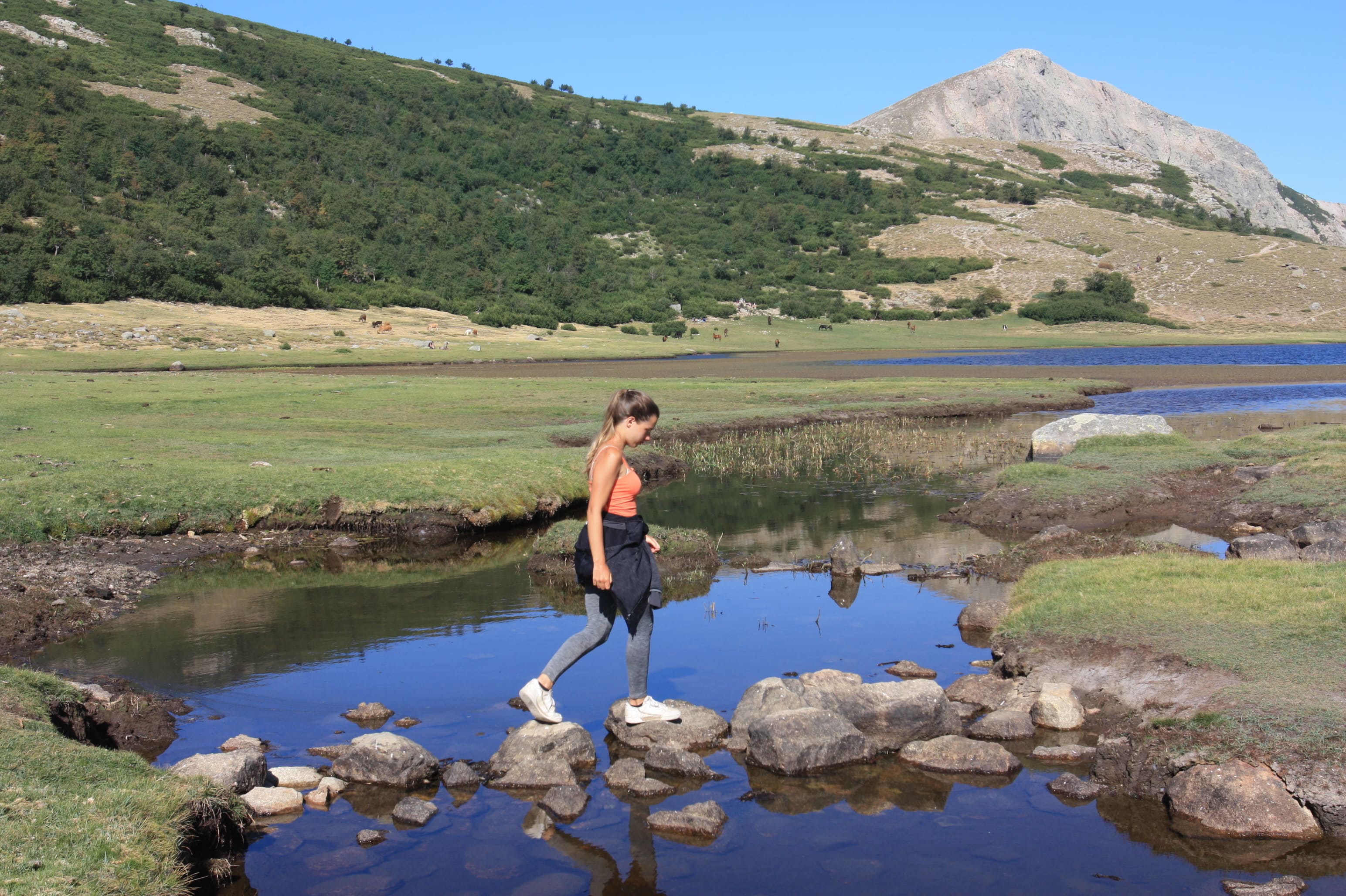 C’est d’abord une large piste à l’ombre des pins laricio. Elle mène aux cascades des Anglais, nom donné à un regroupement de petites cascades et de vasques naturelles au XIXe siècle après que des officiers Anglais de la reine Victoria s’y soient baignés pour profiter de ses vertus diurétiques. C’est ensuite un sentier pierreux qui remonte le vallon de l’Agnone au milieu de roches moutonnées et de dalles polies par les glaciers. Ce vallon, au cœur du plus petit des massifs de haute altitude, est dominé par des pointes, des aiguilles escarpées et de fières pyramides. C’est enfin le col de Porco (2 175 m) qui domine le vallon secret des lacs d’Oro au cœur d’un joli cirque glaciaire et surtout, après une belle ascension, le mont d’Oro (2 389 m) qui offre un panorama sublime sur tous les sommets de Corse et sur la mer Méditerranée avec les îles de l’archipel toscan et la côte italienne.