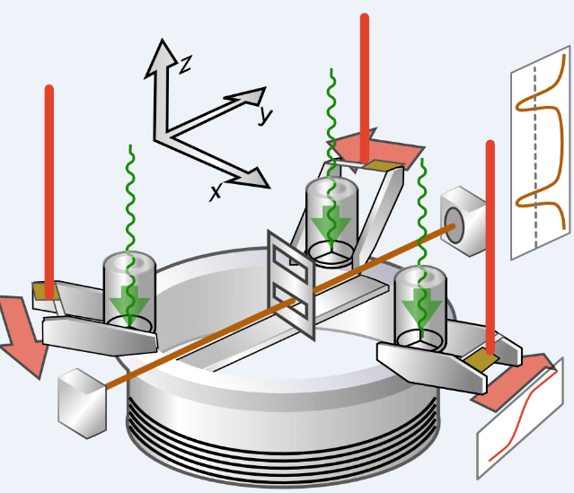 Les trois interféromètres déterminent la position de la bobine par rapport à la verticale (déplacements verticaux et rotation autour de l’axe vertical) et